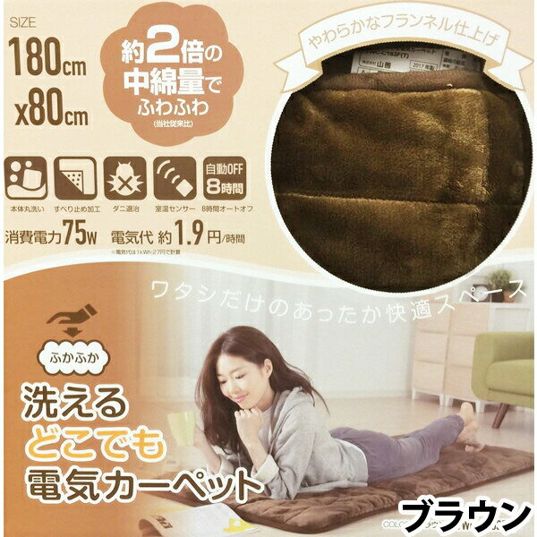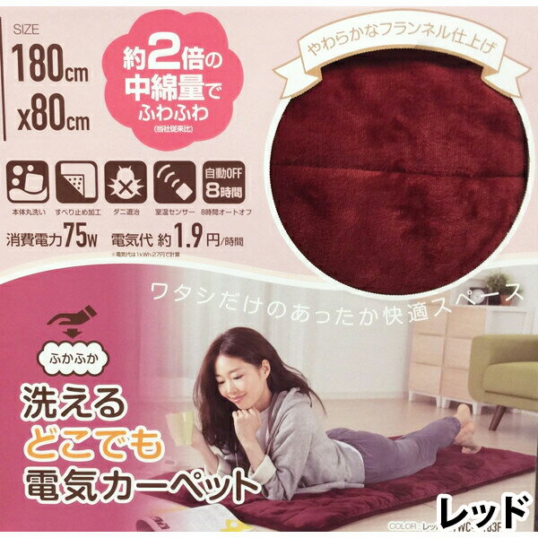 本体サイズ:タテ80×ヨコ180cm 重量約:1.75kg(コントローラー含む) 材質:ポリエステル100% カラー:グレー・レッド・ブラウン・ネイビー 原産国:中国 商品説明 ◇消費電力:75W ◇電気代目安(1時間あたり): (強)1.9円、(中)1.2円、(弱)0.7円 ※電気料金目安単価 27円/kWhを基に算出 ◇消費電力量(1時間あたり): (強)70Wh、(中)46Wh、(弱)27Wh ◇コード:電源コード約1.9m・本体側コード約0.6m ※画像はイメージです。